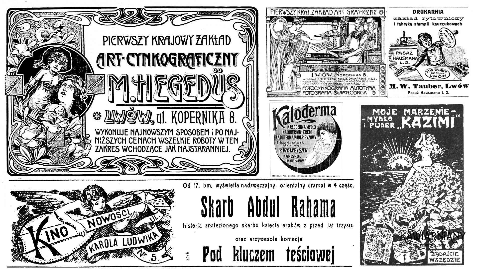 Poniżej zestawienie reklam pracowni Hegedusa oraz nieco mniej okazała reklama drukarni M. W. Tauber z Pasażu Hasumana z 1907 roku. Niedługo później drukarnia przeszła w ręce Friedmana. Poniżej dwie reklamy kosmetyczne z 1912 i 1914 roku. Poniżej reklama kina z 20 września 1917 roku wydana w Kurjerze Lwowskim. Przypominamy, że ul. Karola Ludwika to tak właściwie ul. Legionów i Wały Hetmańskie nazywane dziś prospektem Swobody