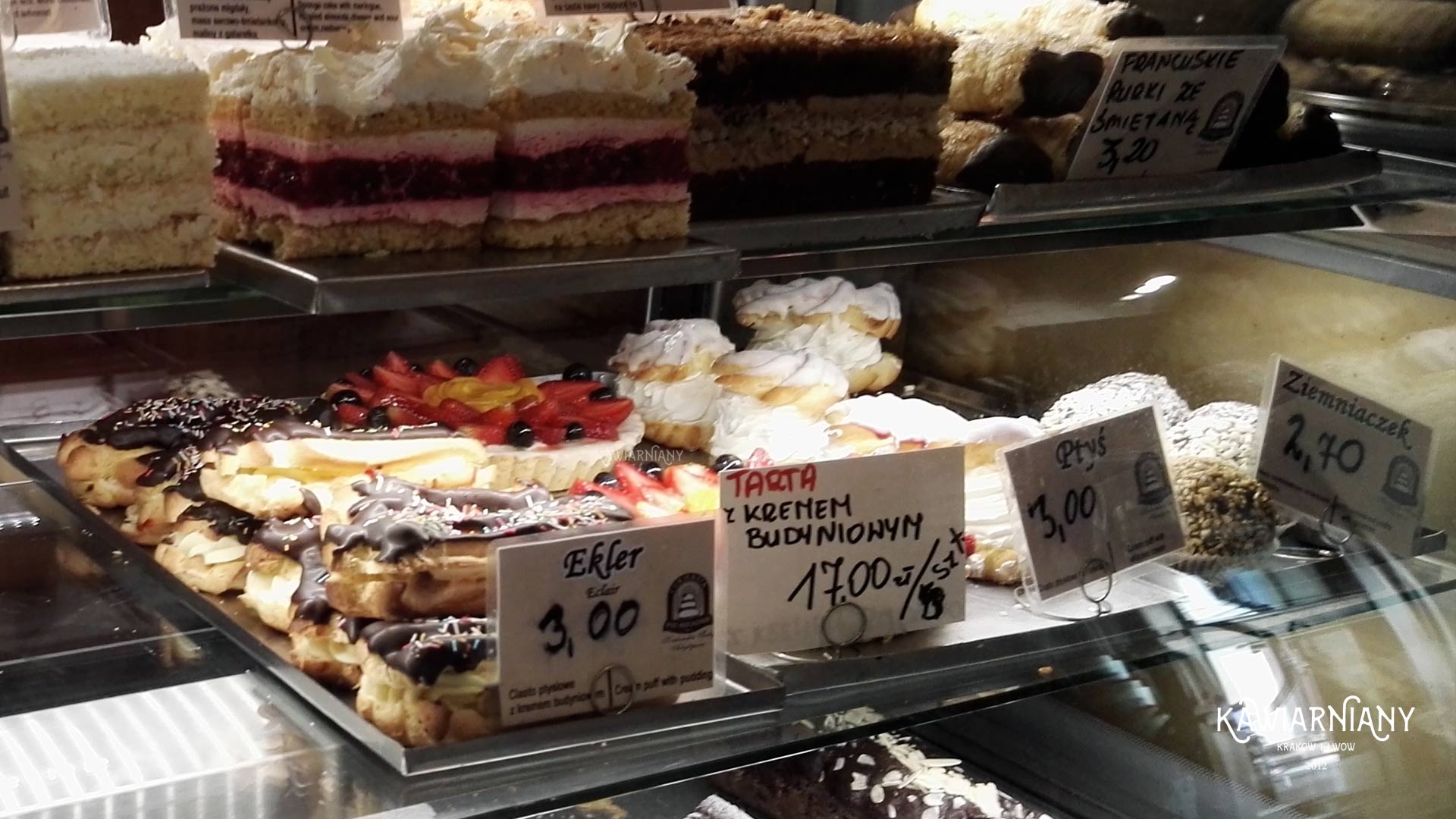 Wyszczególnienie wszystkich ciast i ciasteczek dostępnych w cukierni nie ma zbyt wielkiego sensu. Podamy więc jedynie ceny kilku ze sprzedawanych tu wyrobów by dać ogólny wyraz poziomu cen w lokalu. Za ciastko Rafaello płacimy tu 4,20 zł, tyle samo za Cappucino. Ekler czy Ptyś wyceniane są na 3 złote. Ziemniaczek na 2,70 zł. Torcik hiszpański za 3,50 zł, ciastko WZ za 4 zł, Czarny Las za 5,50 zł. Dodatkowo kapuśniak za 2,50 zł czy cała chałka drożdżowa za 13 zł.